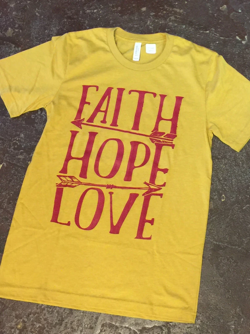Faith, Hope, Love mustard t shirt made of Cotton polyester blends . Inspirational boho chic t shirt.