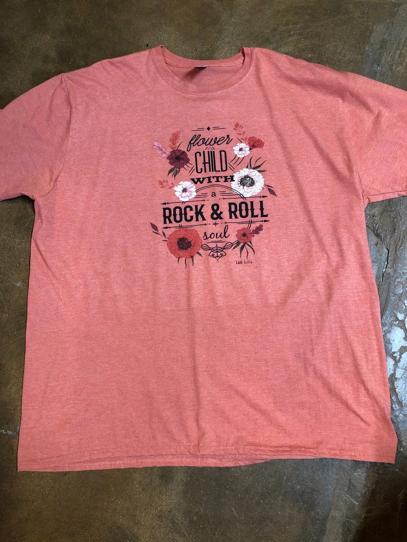 Flower Child with a Rock & Roll Soul T-Shirt.ย Gildan Poly/Cotton blend.