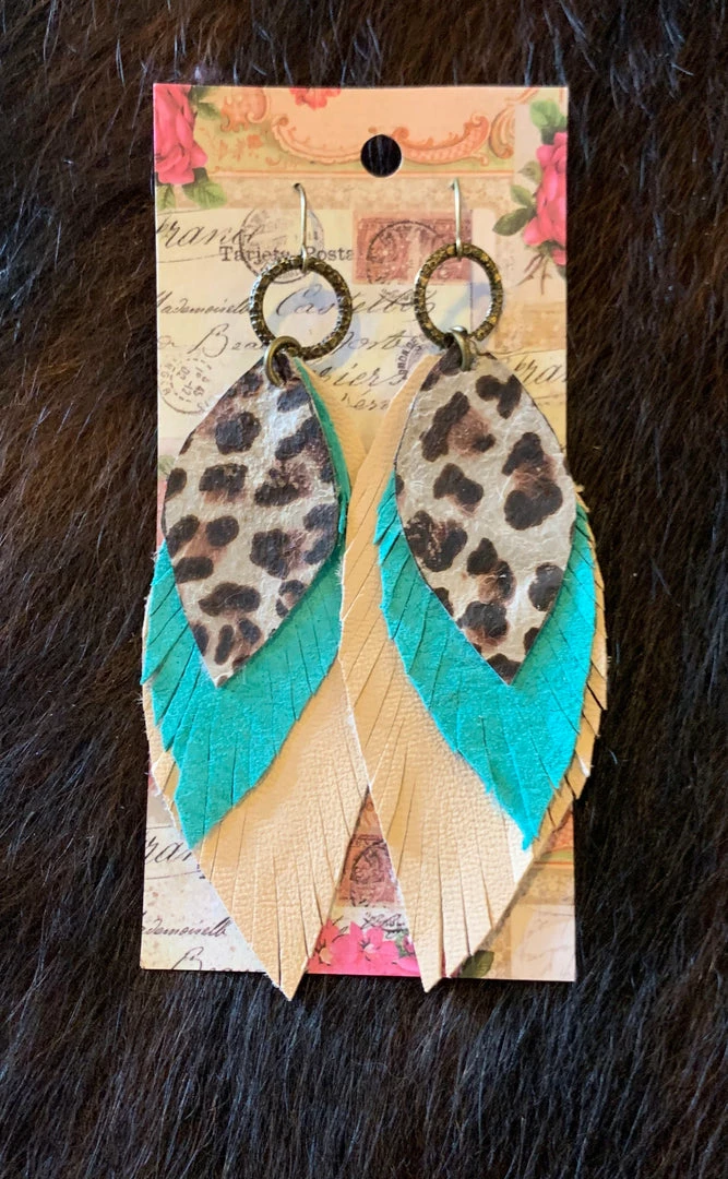 These leopard print feather earrings have turquoise and white leather.Ā On a french hoop.