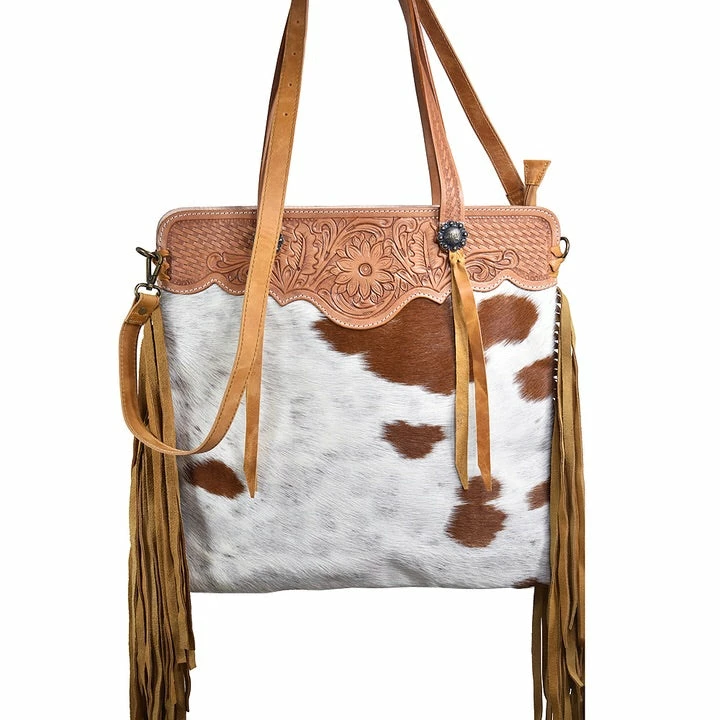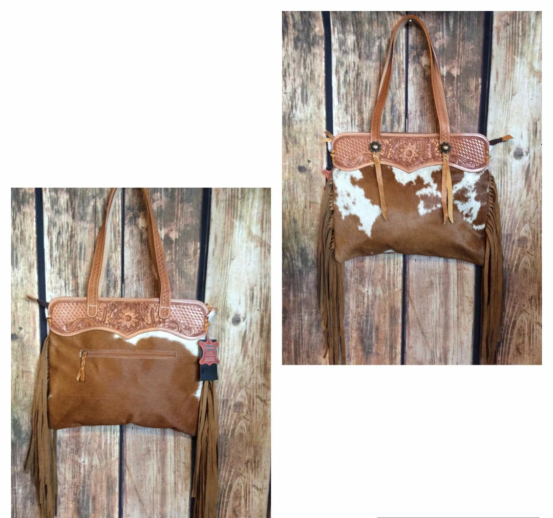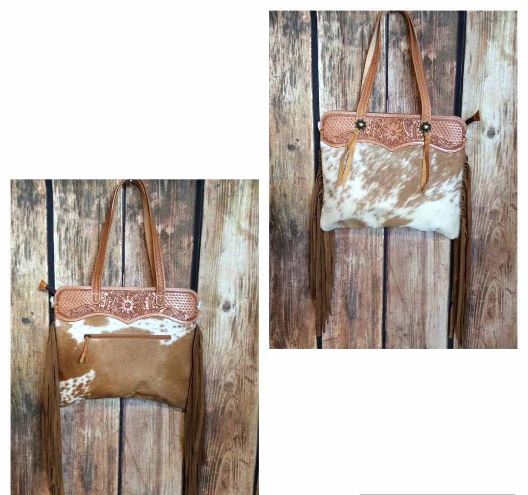 Tan and White Hair-On Purse with leatherΒ embossed top andΒ and hoop handles.Β Β Fringe sides.Β Hair-on will vary.