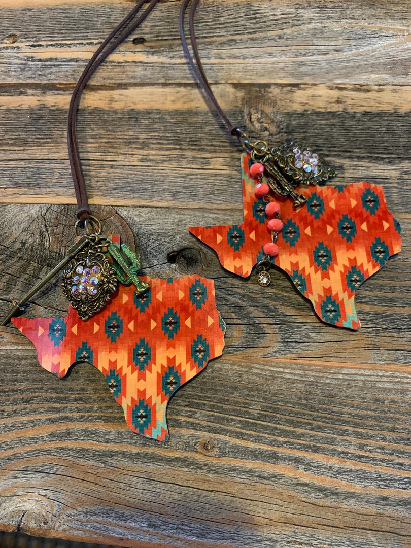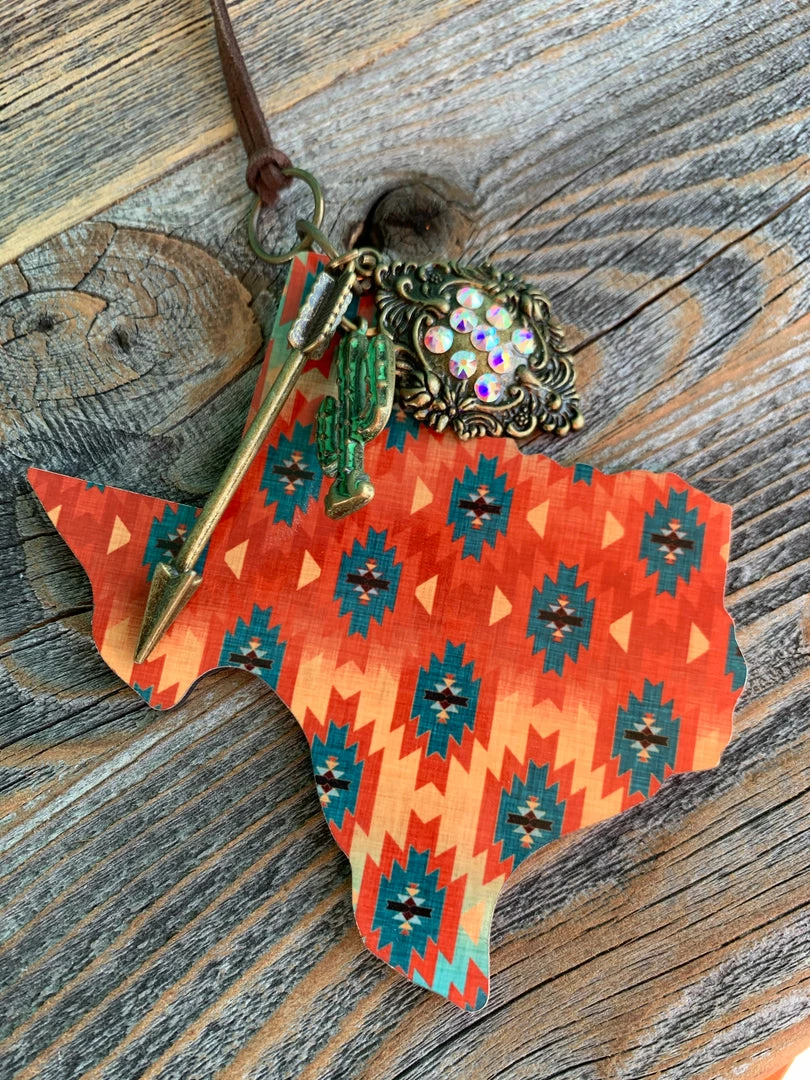 Texas Shape Car Charms made in USA.ย Each has a unique dangle with feathers, beads arrows or medallions and hangs off leather strip to tie on your mirror or use as an ornament.ย ย