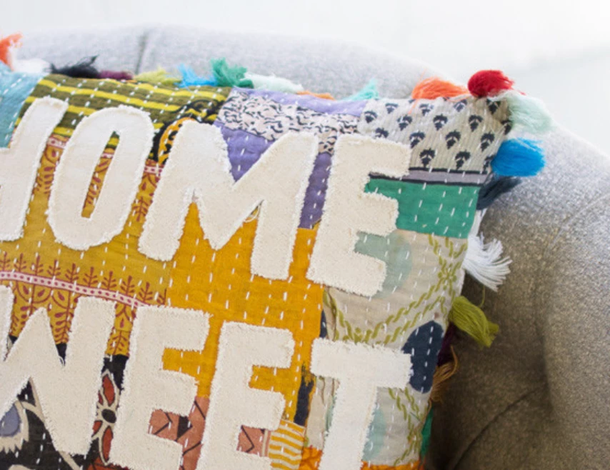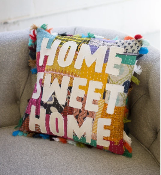 Vibrant colors in Kantha quilts make up the body of this pillow with appliqued HOME SWEET HOME. Colors may vary.