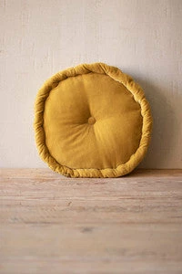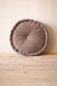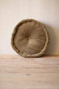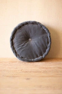 Supple velvet-covered round cushions for decorative use or tossing on the floor to watch tv. A covered button at the center and a rolled tufted edge finish these gems.
