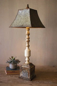 Striking tall turned banister lamp paired with an aged square metal shade.