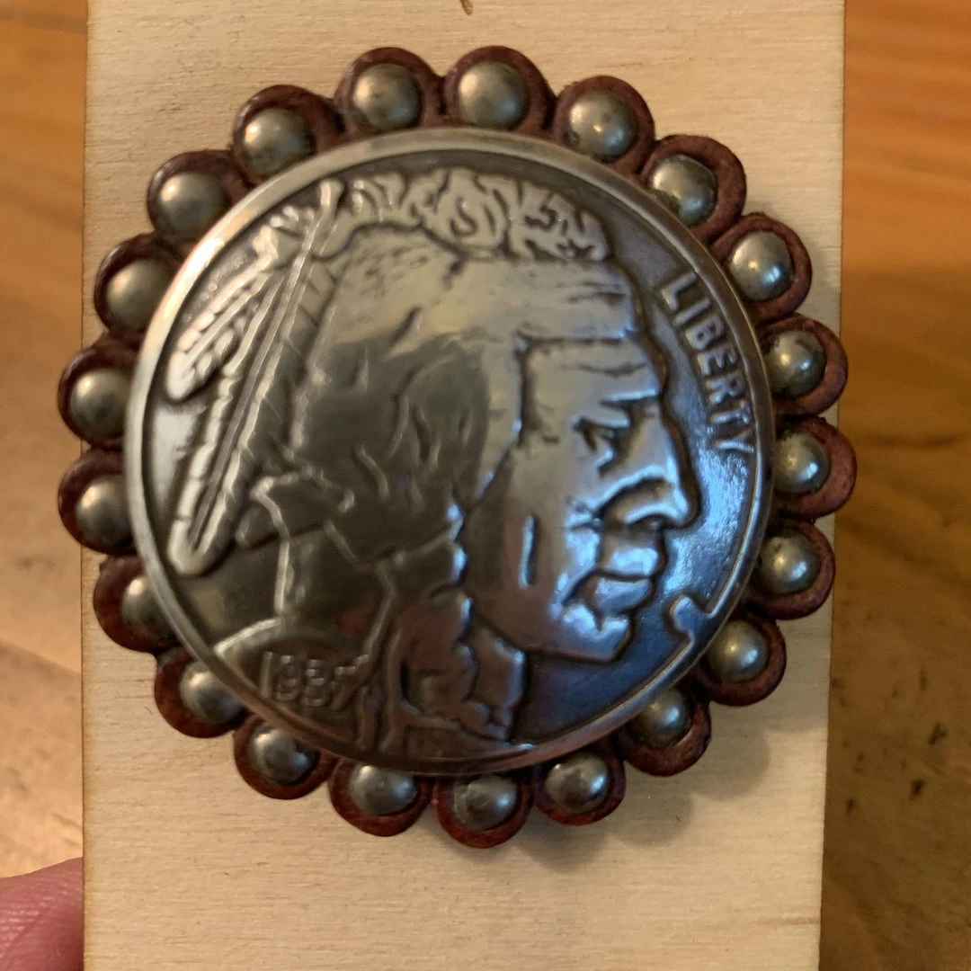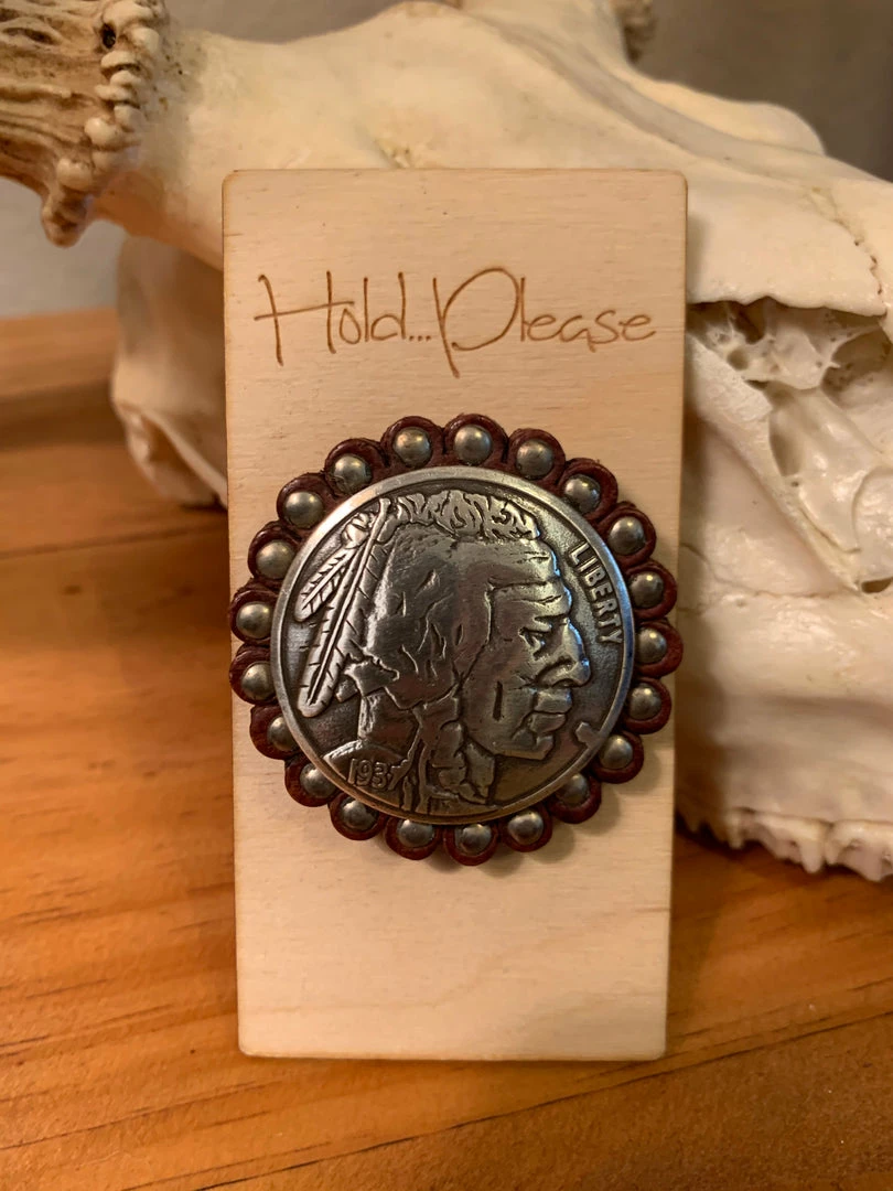 Indian Head Cell Phone Socket with leather studded Concho on pop up with peel and stick backing.