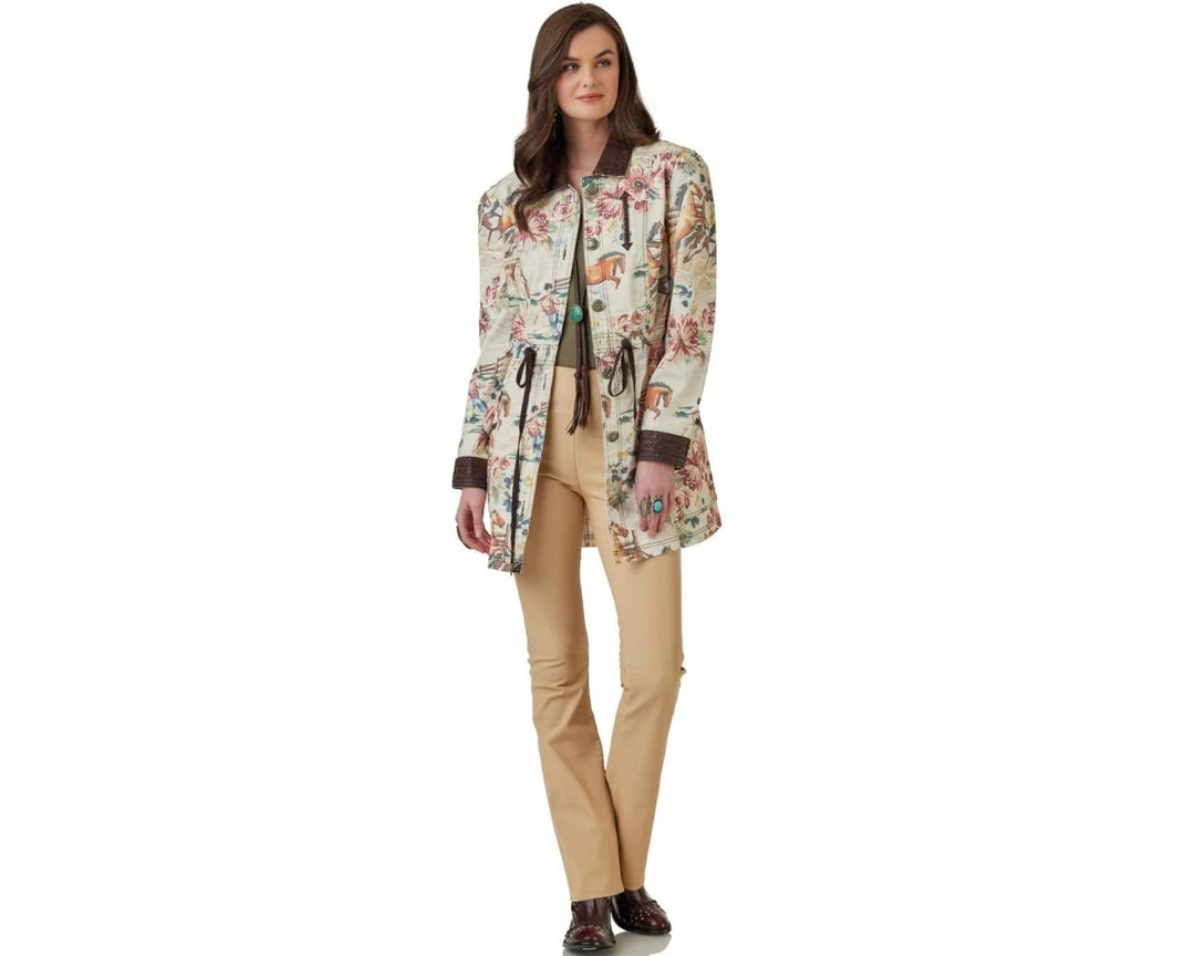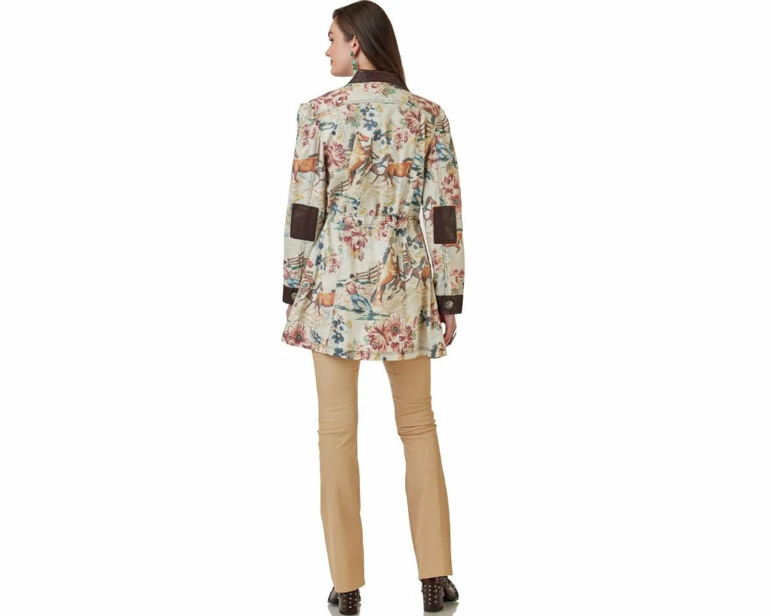 The La Joya Real is a South Texas dude ranch where we spent our childhood summers with Granny Eller (Eloise) and this print is a tribute to all the work she did on the ranch, but balanced with the pretty femininity she never really got to enjoy. The lightweight denim is the perfect canvas for the custom print, trimmed with a contrasting leather collar and cuffs, finished with a drawstring elastic waist for an extra-flattering fit. Timeless beauty!