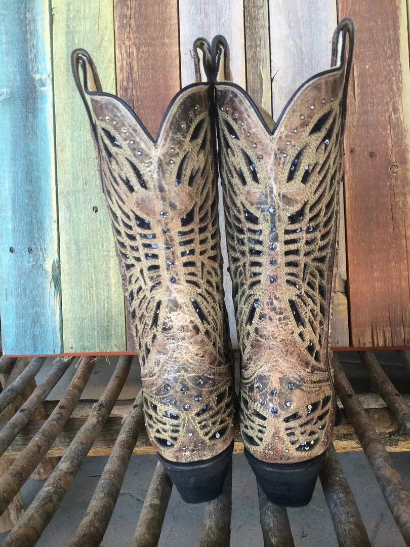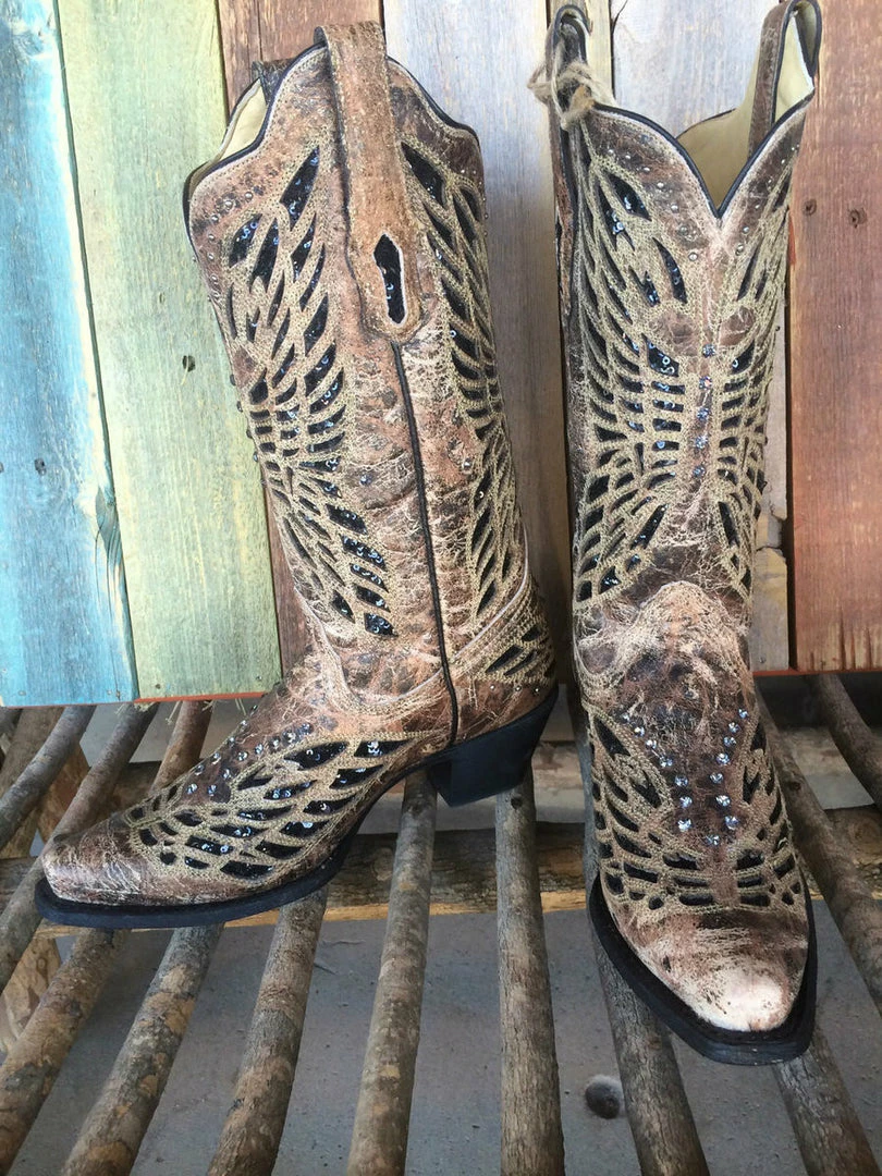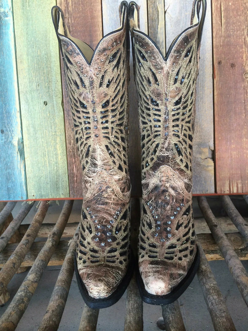 Turn heads wearing these stunningly designed women’s cowgirl boots. Handcrafted in distressed bronzed leather, black sequence inlays in the shape of butterflies with crystal accents shimmer with eye catching results. Soft lining and cushioned insoles provides much comfort for long wear. Snip toes and leather outsoles give off that true western boot look. Pull tabs and dip openings at the top makes it easier for pulling on.