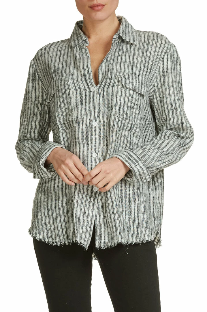 White and Black Striped Button Front Shirt with Fray Fringe Hem.ย ย