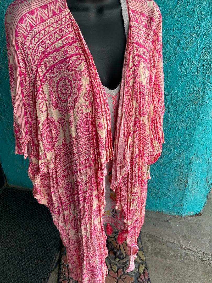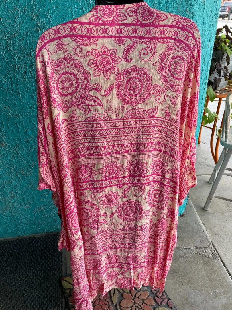 Ivy Jane Pink Duster in floral print with drape style and ruffle trim. Β One Size