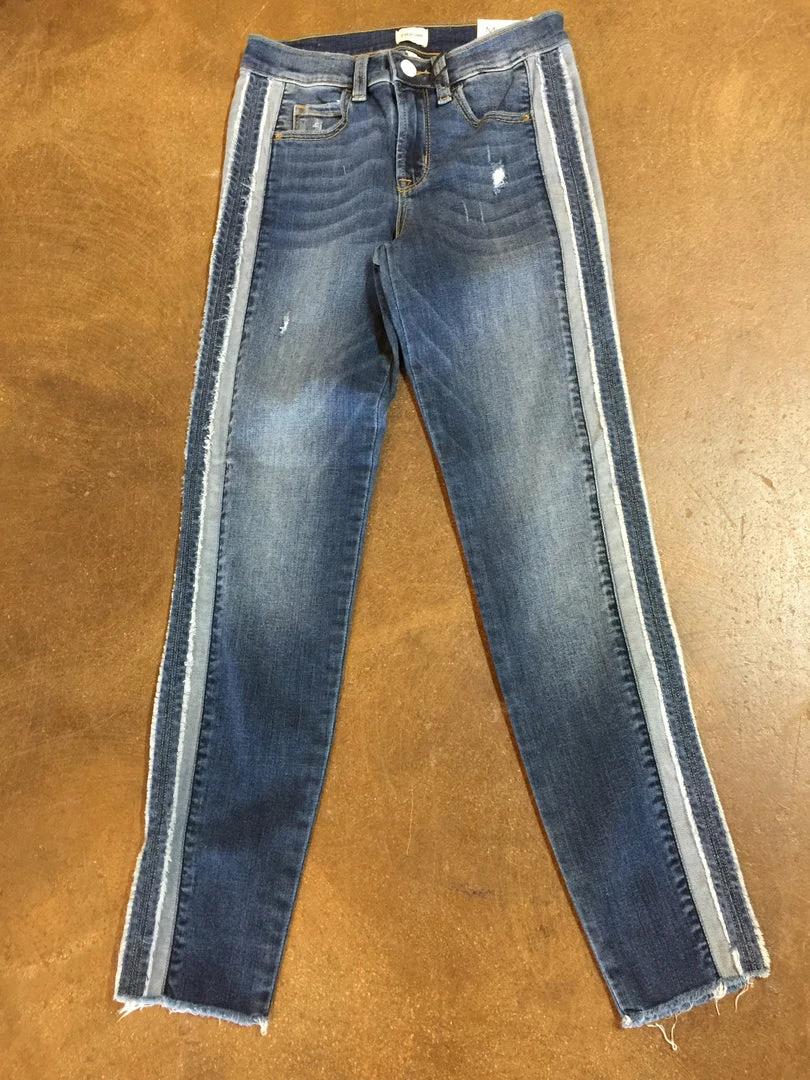 Sneak Peak jeans with contrasting side details and unfinished hem.