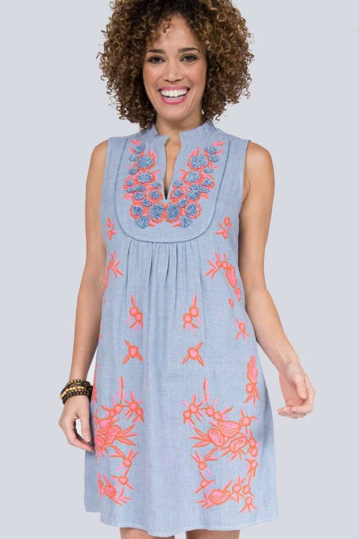 This Uncle Frank Sleeveless Dress in a chambray mini stripe with bright pink floral applique is stunning. In 100% Cotton it is sure to be a go to dress for those hot summer days and nights.