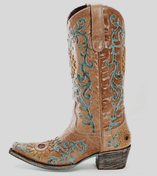 Change your life, change your mood. This womenβs boot features a tan leather foot and shaft accented with overlay turquoise design and daisy flowers. Single stitch welt and leather sole.Β