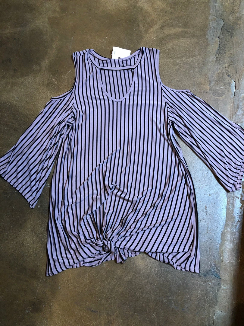 Purple and Black Striped Tunic with tie front and cold shoulder.Β Β Rayon and Spandex Blend