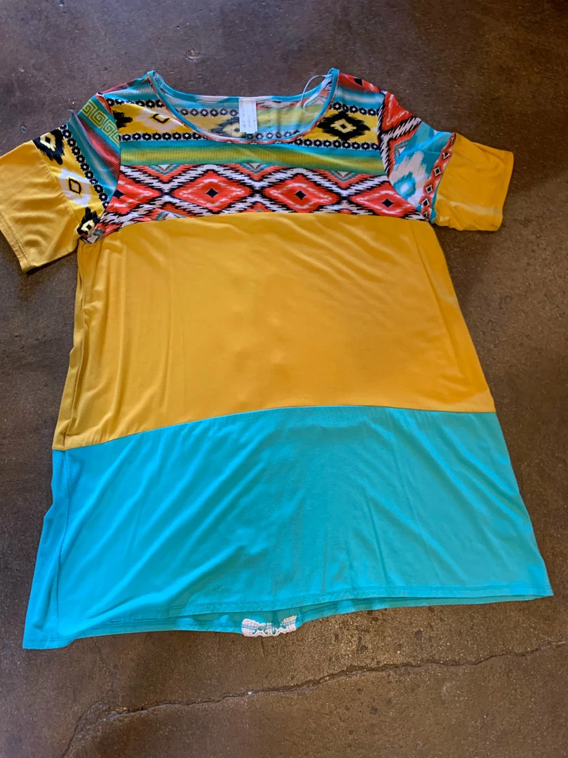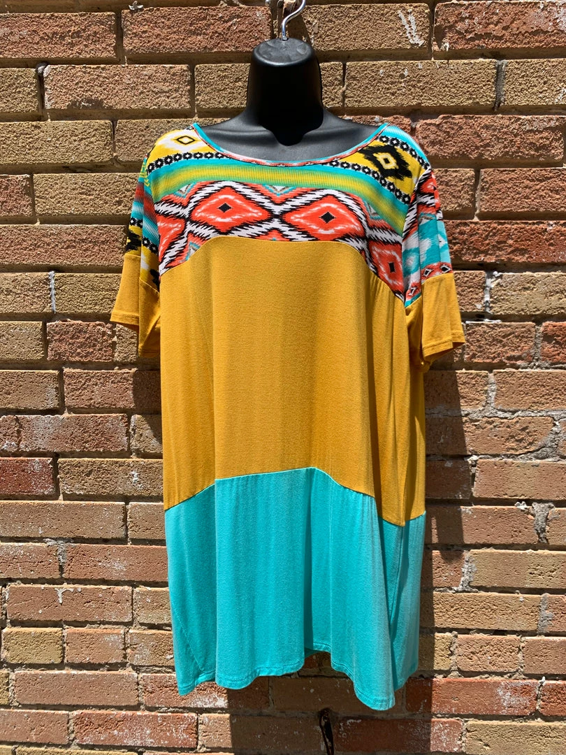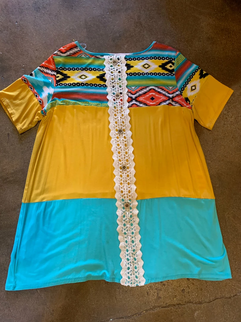 Navajo design tunic with mustard and turquoise and lace strip up back with buttons attached for intricate detail in Plus Size