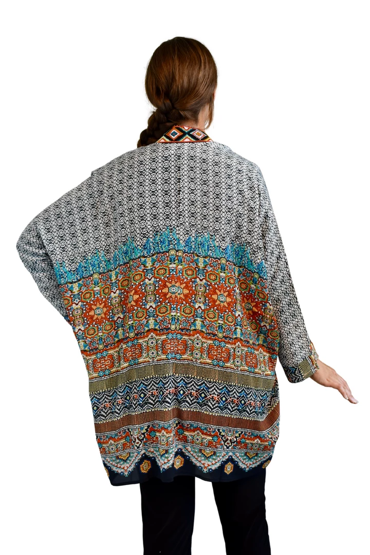 This bohemian-chic kimono features long sleeves and a beautiful multicolored geometric print.