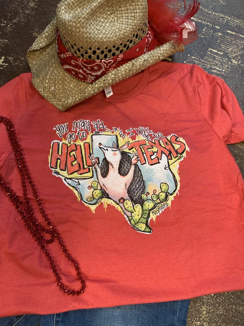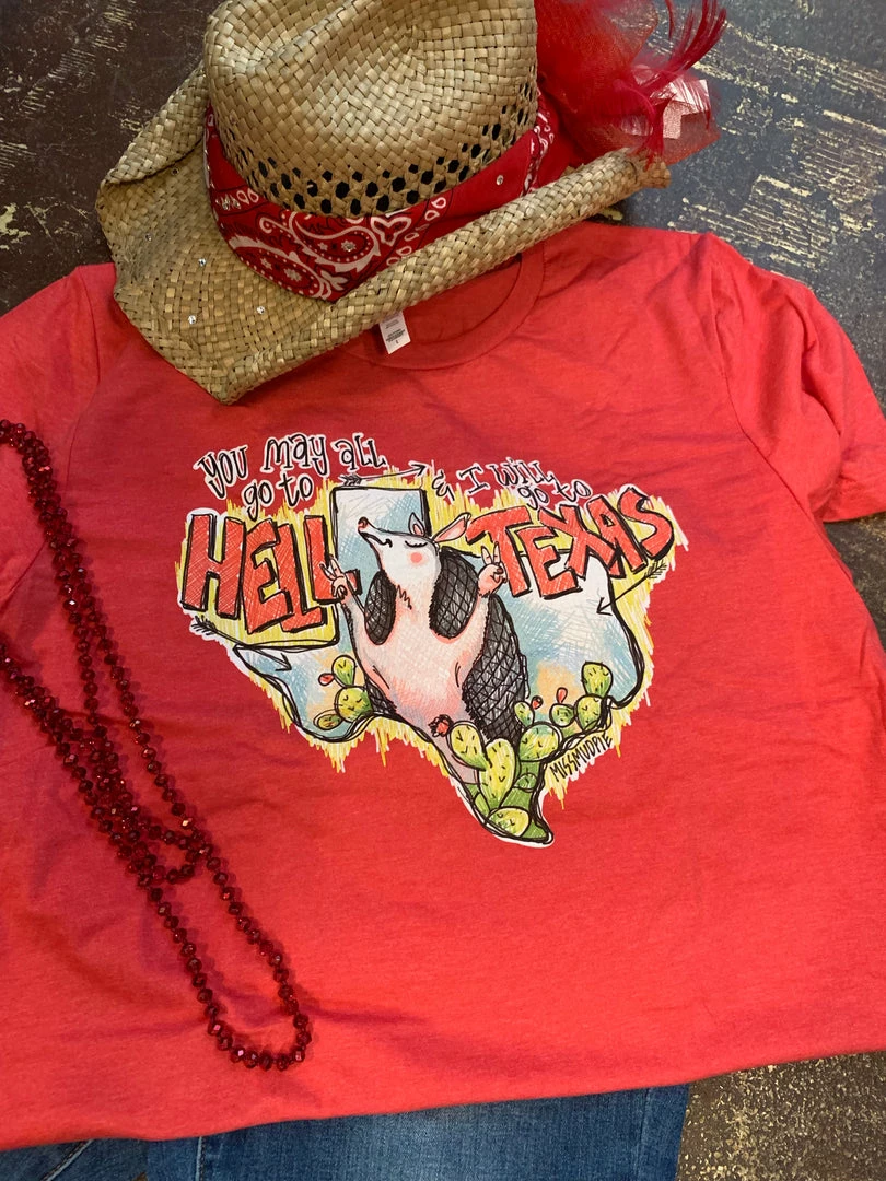 Saying -β You May all go to Hell & I will go to Texasβ T shirt in red with V-neck.