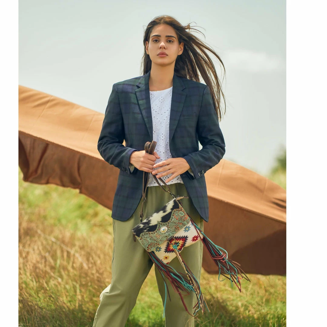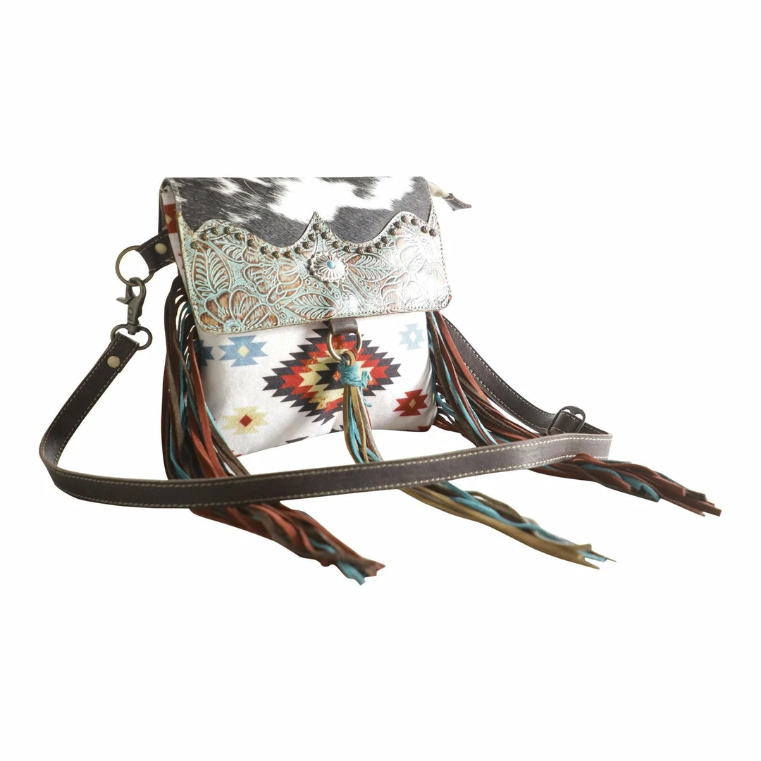 The Aztec pattern of the bag is enriched by the turquoise leather flap, giving it a unique look. It comes with zippered sections on the top and backside of the bag.
