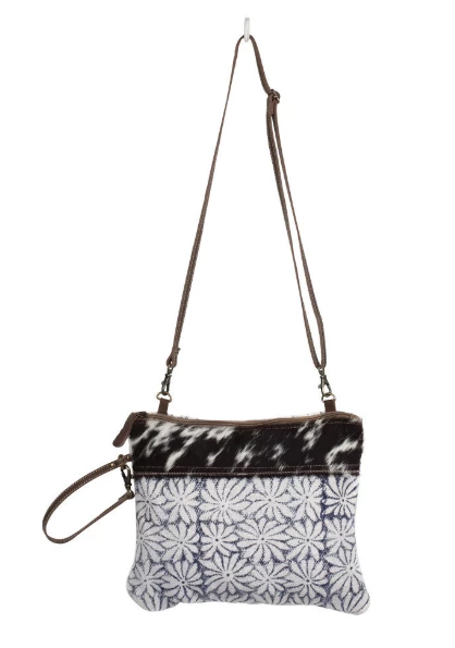 The combination of cotton rug with black and white shaded Hairon looks fab. This small bag has a beautiful design to compliment your style. You can use this bag as wristlet as well as cross body bag.