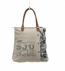 This canvas tote bag is spacious and stylish for you. And it has hairon segment in front. The tote bag is accented with genuine round leather handles.