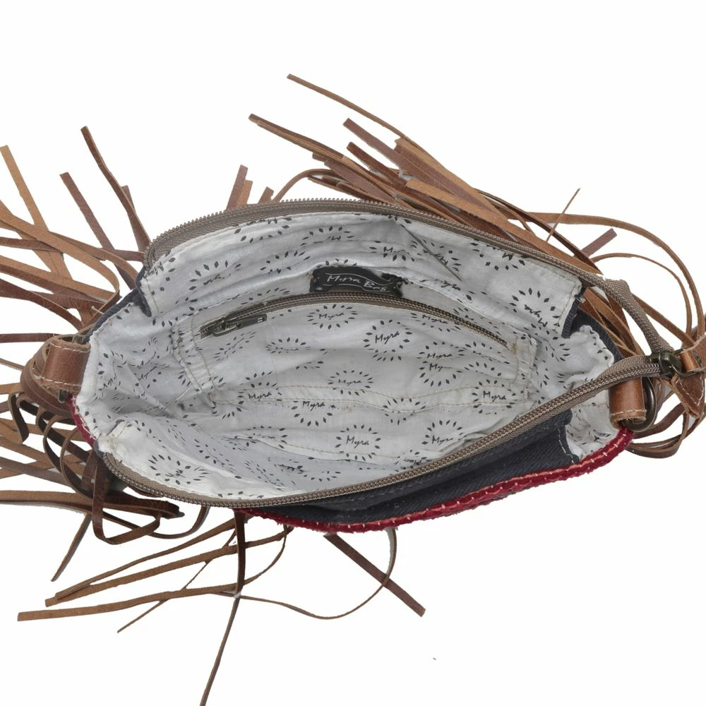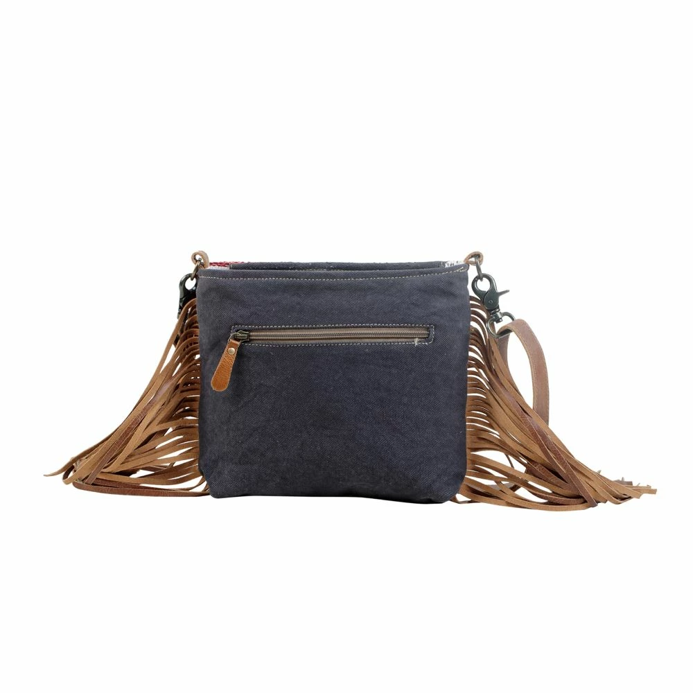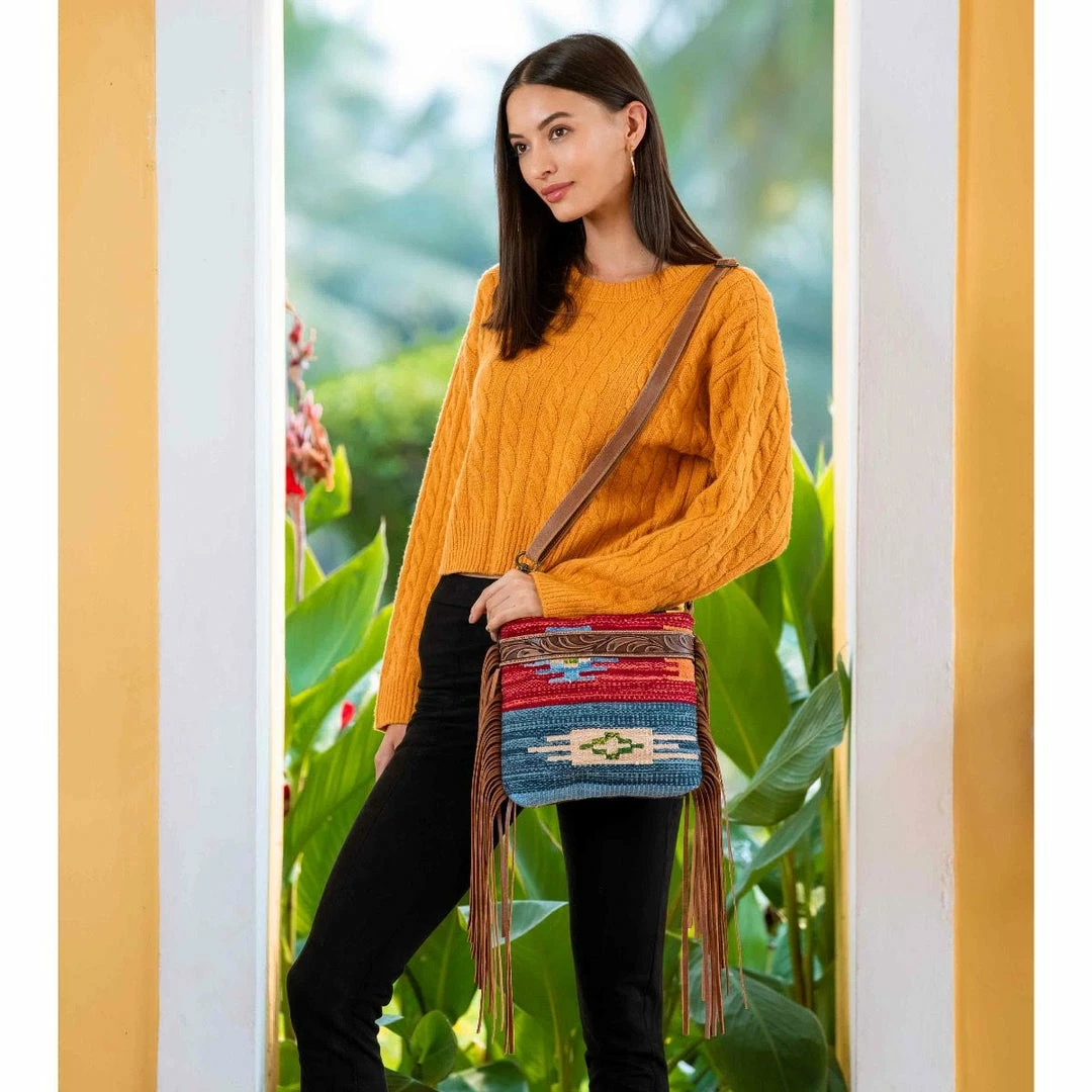A high quality, upcycled cross-body bag adorned with bright hues of amber and blue. It has fringes on the sides, a small outer pocket, and innerย