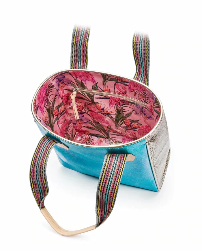 Our Natasha Classic Tote is perfect for life-on-the-go and it packs a statement with a metallic blue exterior and metallic, black-speckled side panels. Topped with comfortable woven handles, this multi-functional tote is accented with leather and crafted to hold its shape. Our tote features a roomy interior and pockets; ideal for carrying your laptop, keys, and phone.