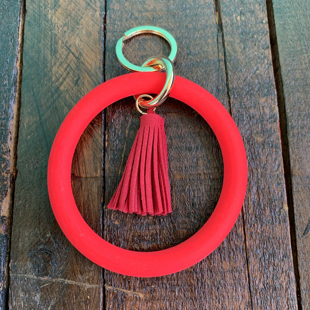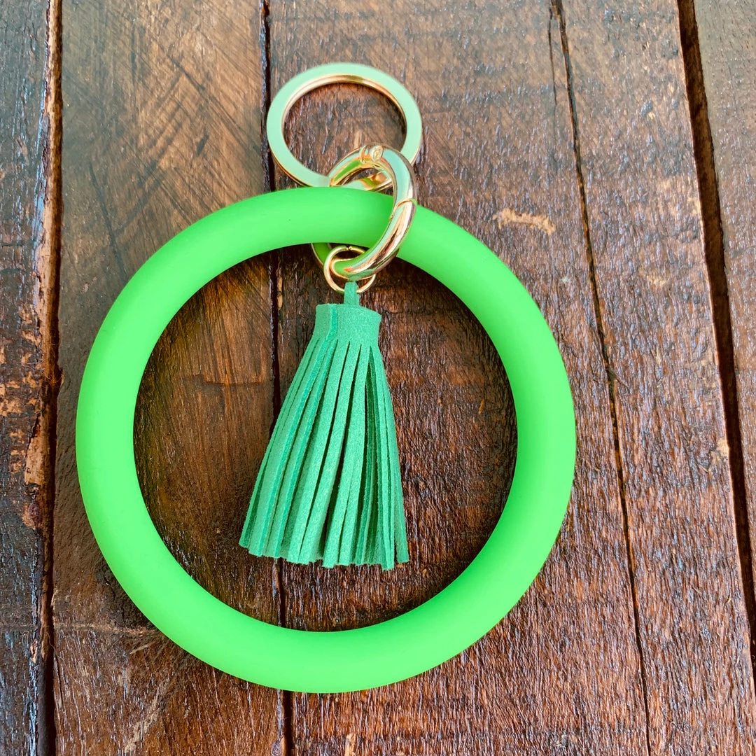 Rubber Neon Bracelets Red and Green have Fringe, Orange has a Love Charm