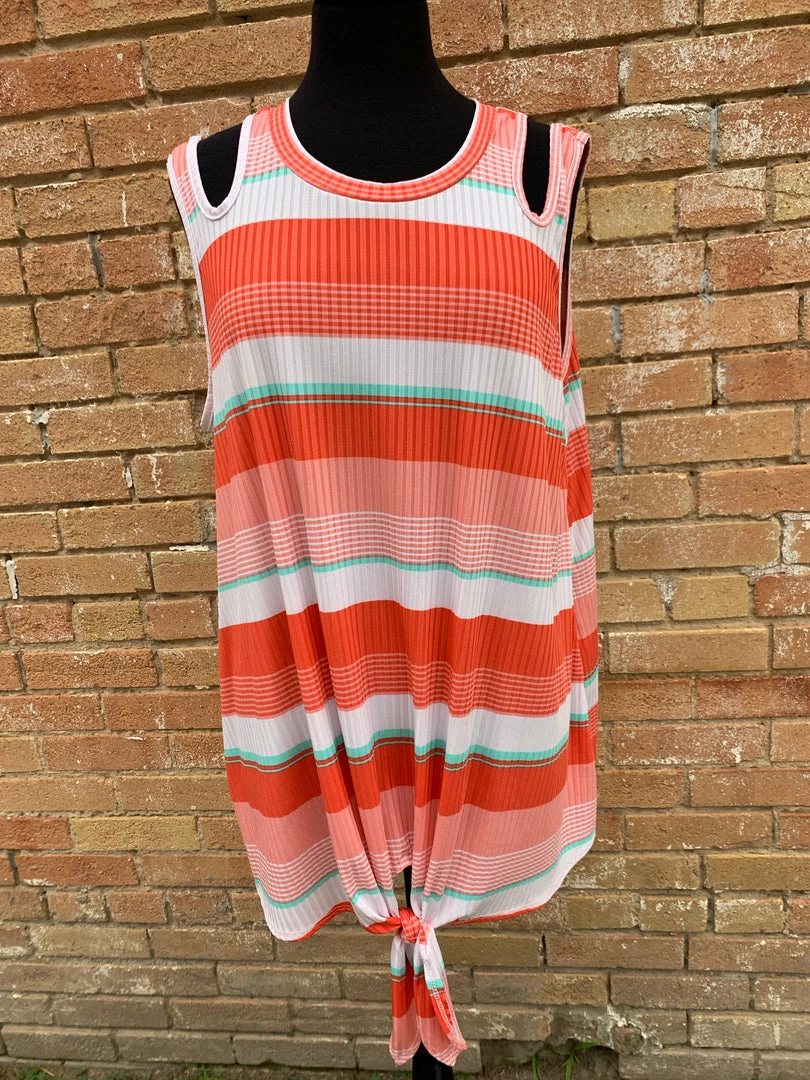 Peek-a-BooΒ shoulder tank top inΒ Coral/Mint and White stripe .Β