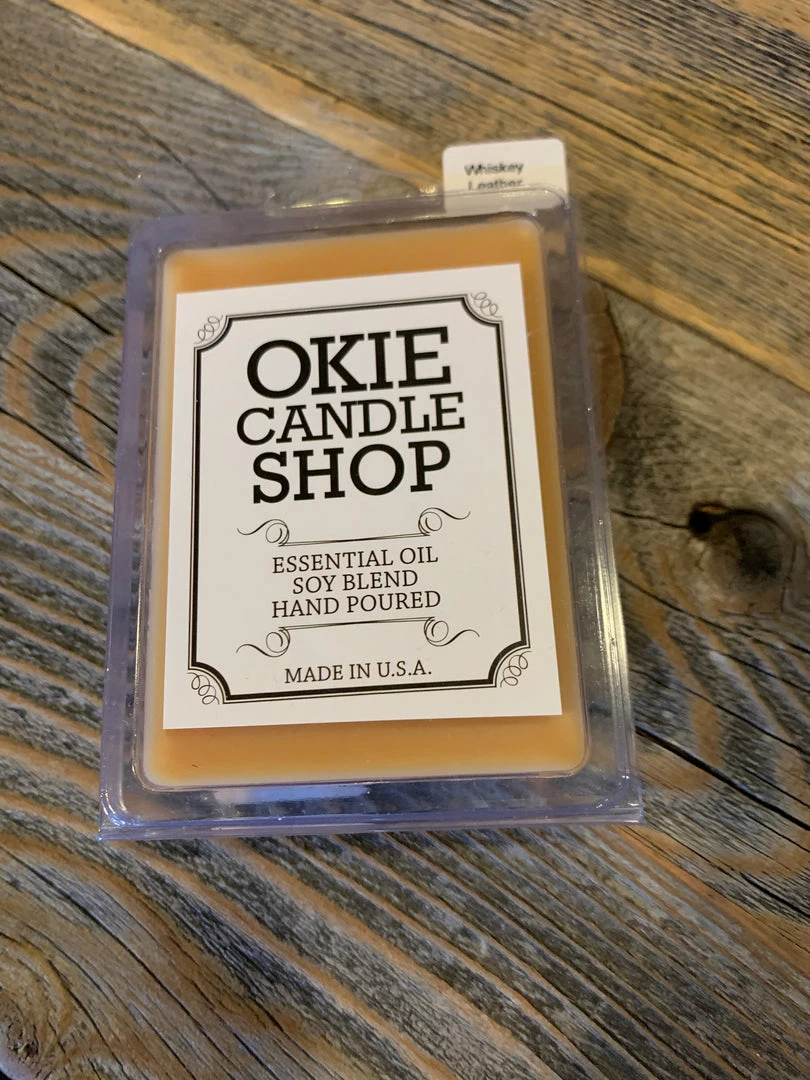 Whiskey leather is made of soy wax and is fragranced with leather and coconut bourbon. ย Okie Candle Shop creates outstanding candles that are hand-poured and available in beautiful, vibrant colors, and fragrances.ย Everything is made with soy wax and high quality essential oils. We are a family-owned business with 11 years in the industry and counting.