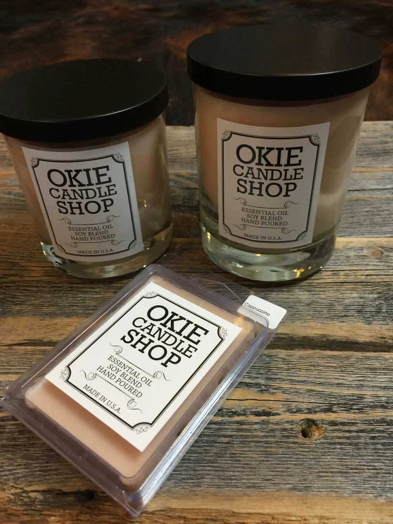 Okie Candle Shop – Cappuccino Candles in various sizes and wax melts.