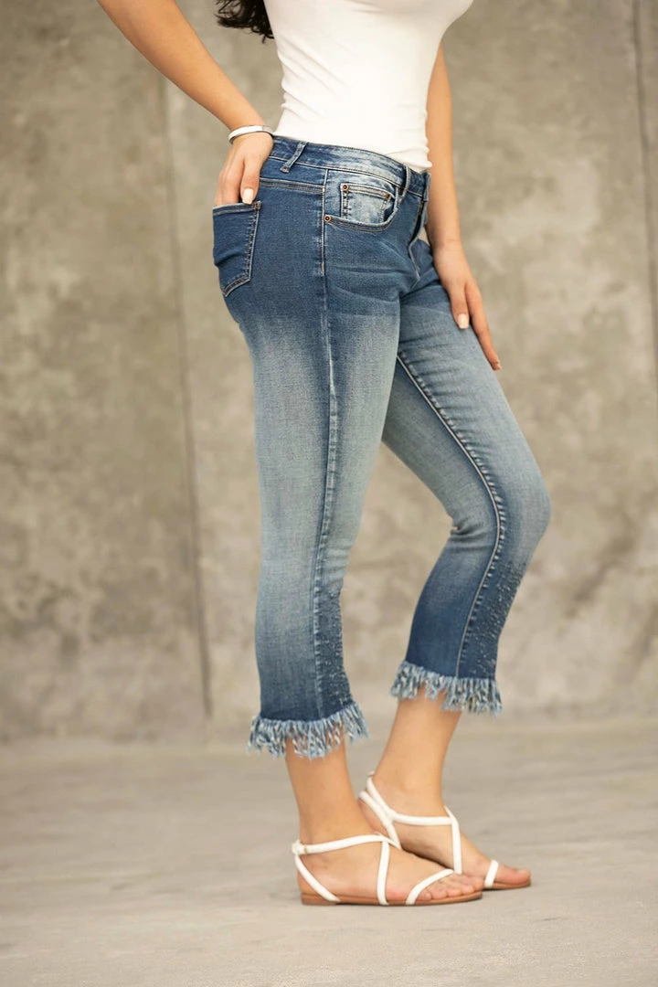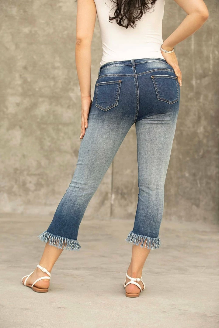 These distressed bell bottom capris cannot be found anywhere else! The fringe detail looks elegant with sandals or flats and an elegant look to your outfit.