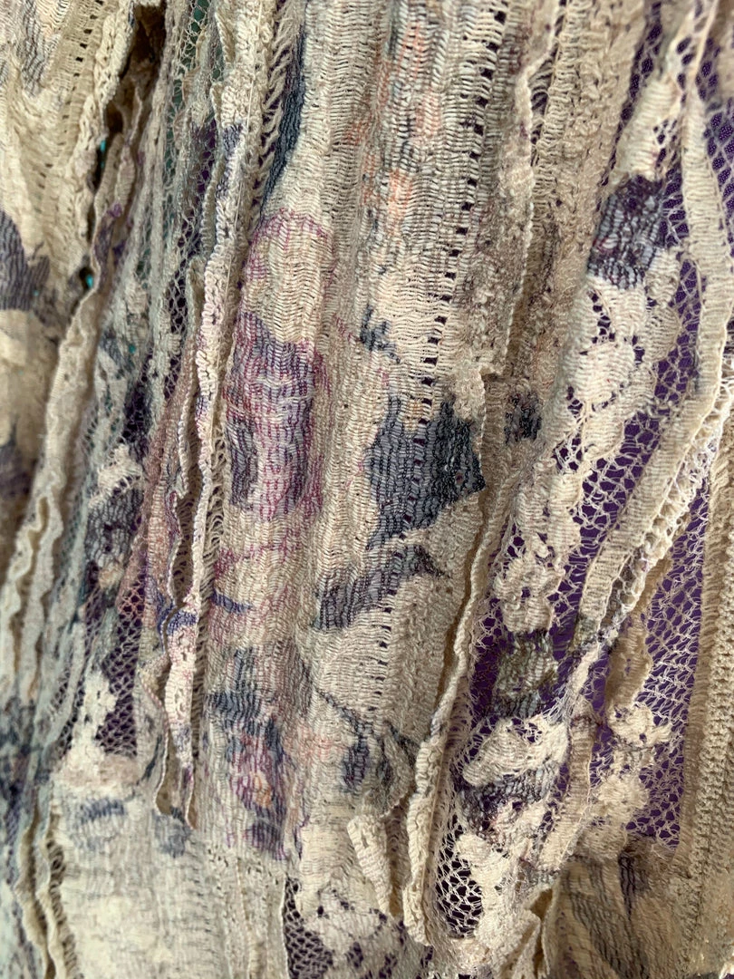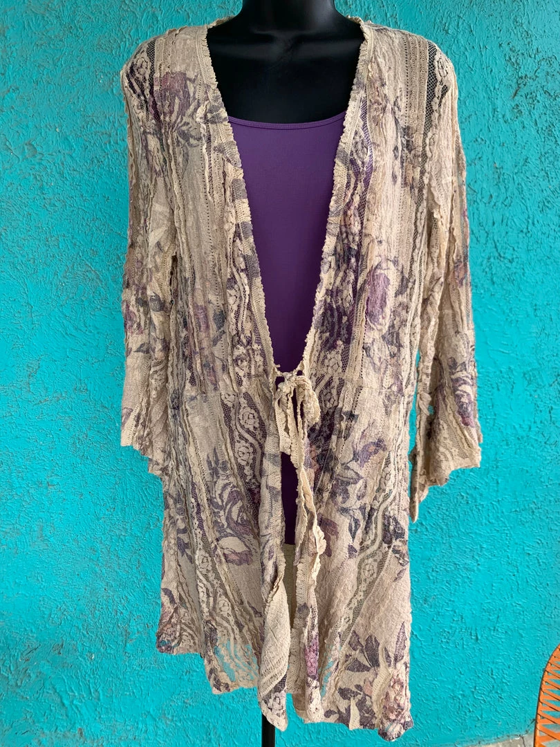 Origami Lace Kimona with textures and prints in beige with purple floral prints .