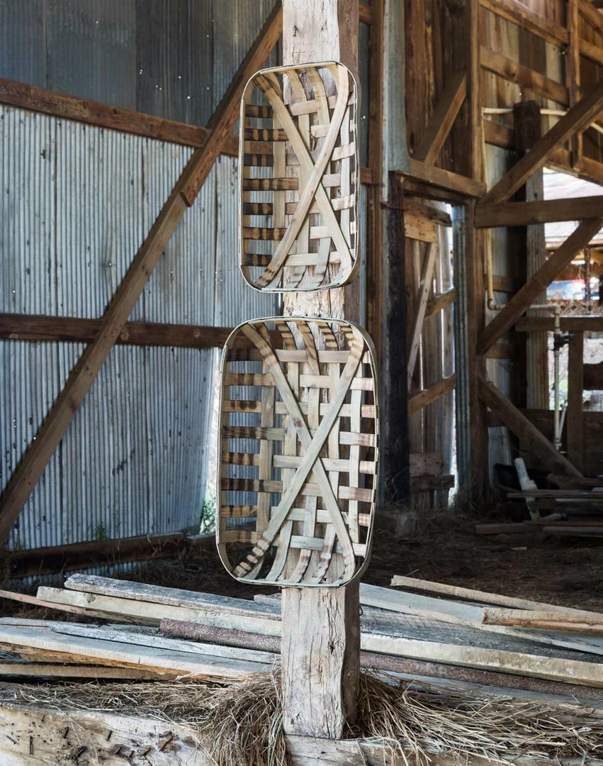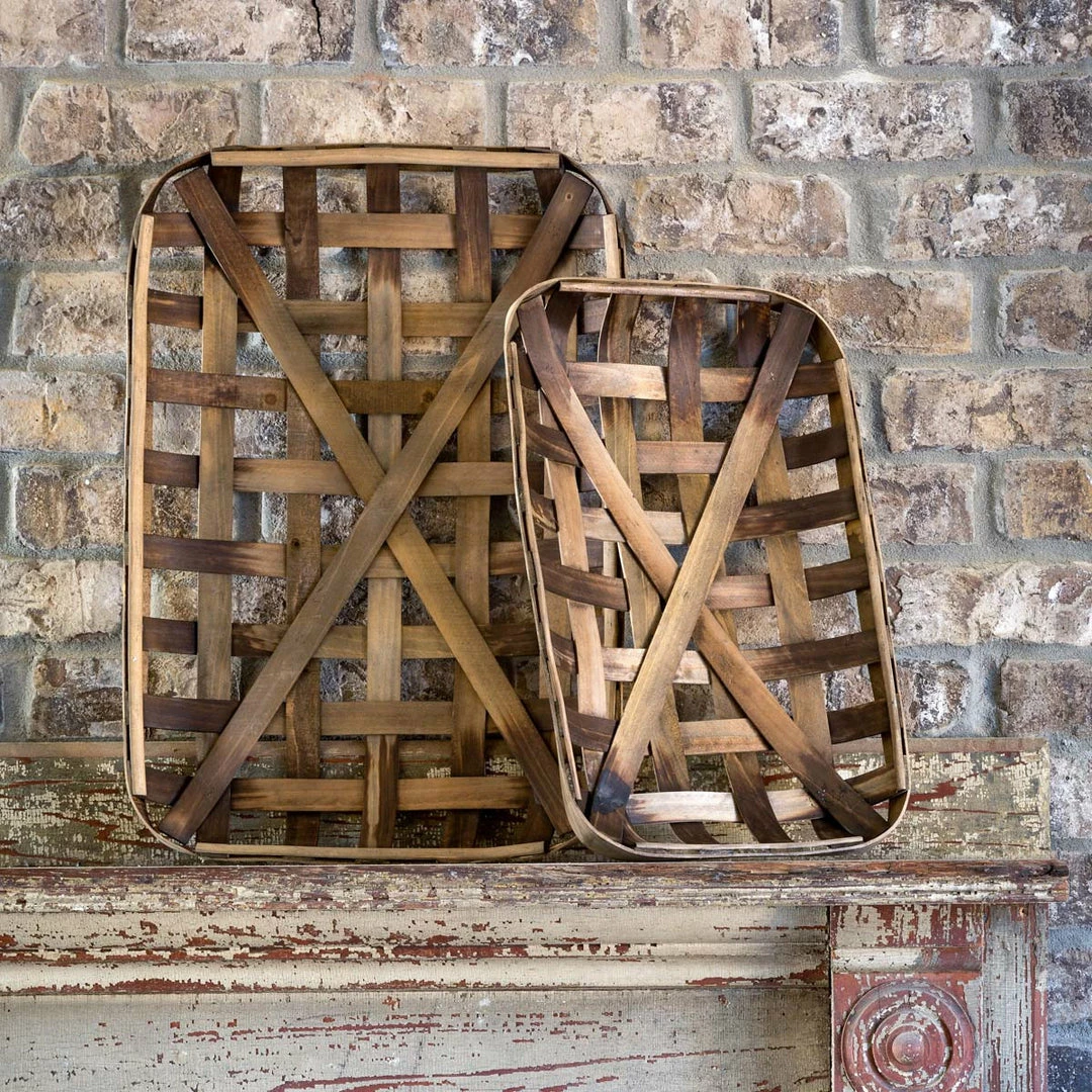 Showcasing authentic wooden strip-construction, these small tobacco baskets double as clever wall art and display pieces. Set of 2, one smaller, one larger.