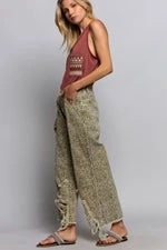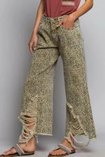 Animal prints are everyone favorites favorite at the moment! Our wide opening animal print denim featuring button and zipper closure, 5 pockets, distressed detailing on bottom and finished with raw edges.
