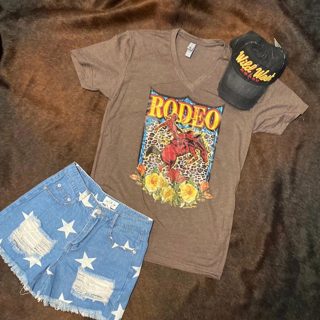 Custom design v-neck t-shirt with bucking bronc rodeo screen and animal print background.