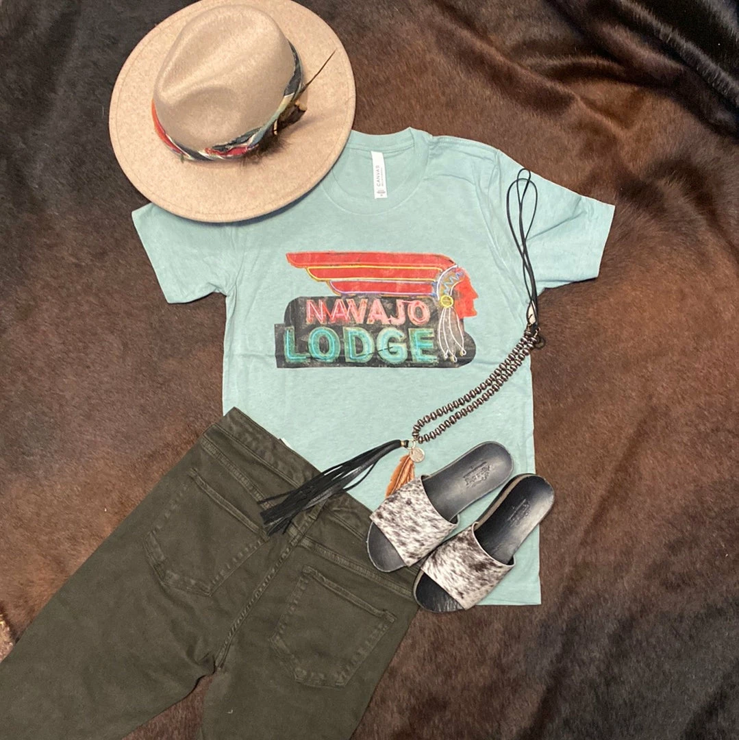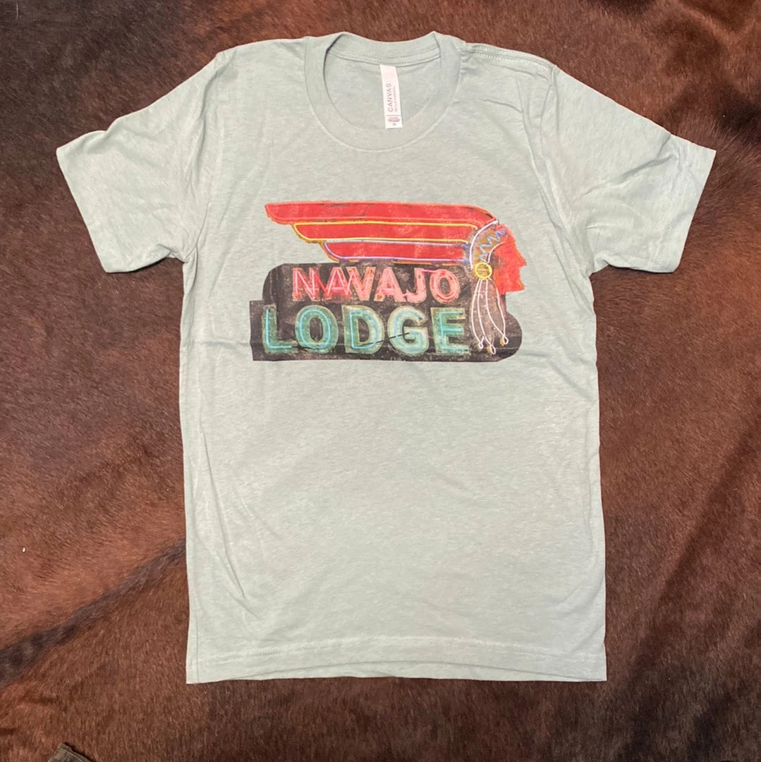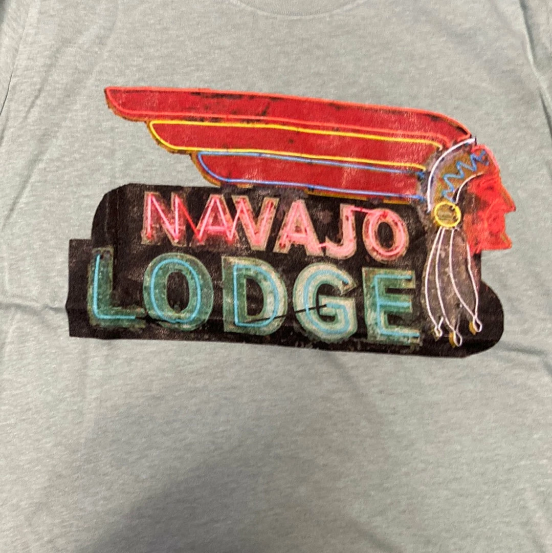 Custom printed “Navajo Lodge” neon sign T-ShirtΒ with a crew neck.