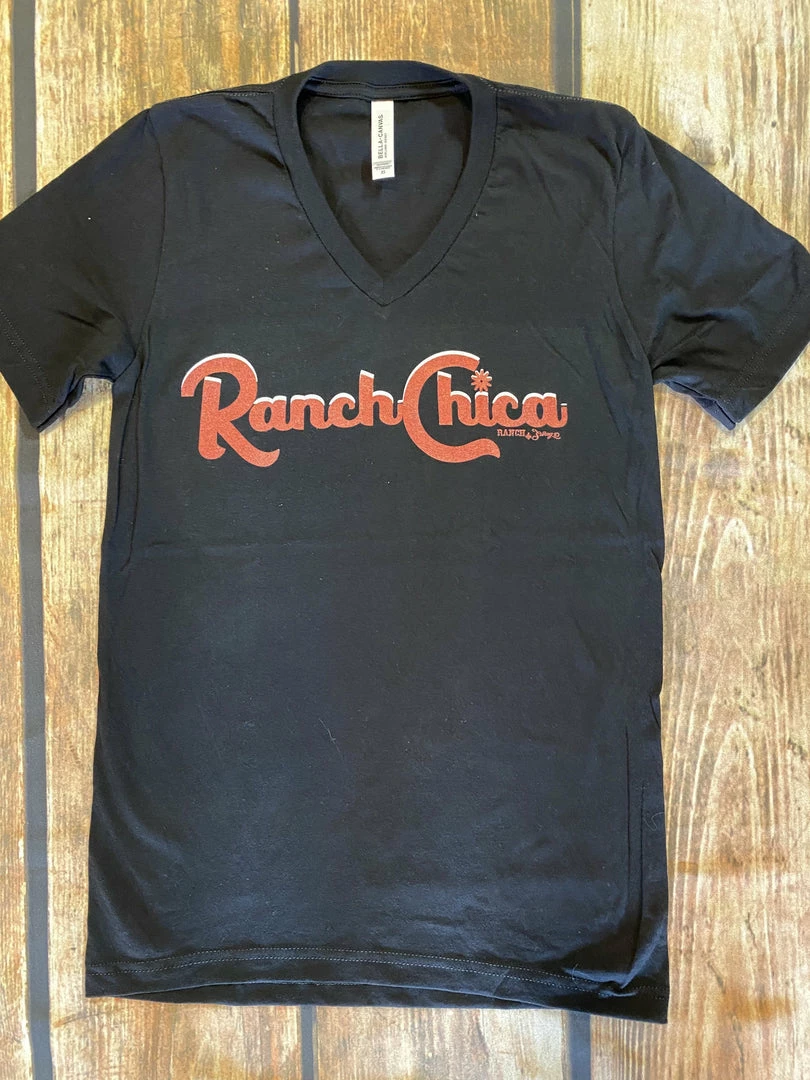 Ranch Chica Red on Black V-neck Bella Canvas .