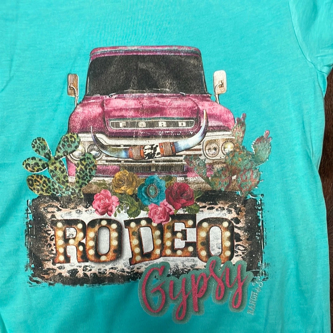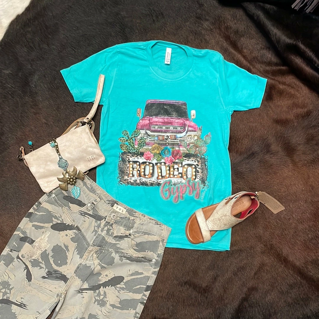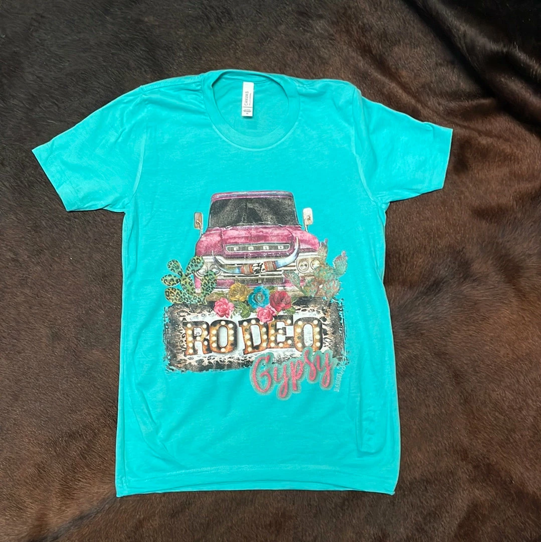 Custom printedΒ crewΒ neck t-shirt “Rodeo Gypsy” pink truck screenprint.