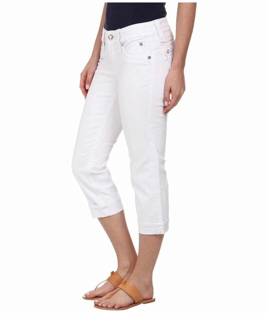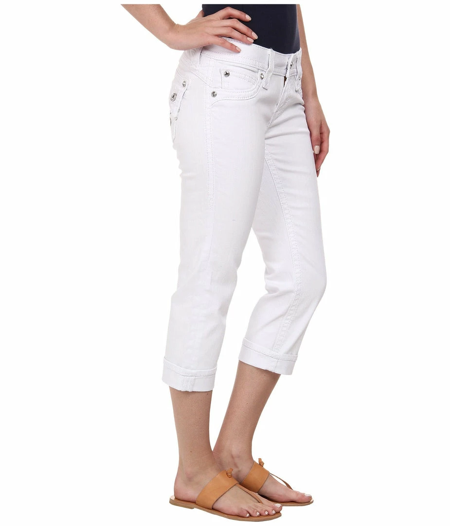 Capris in a whiteΒ wash with hand-sanding and whiskering. Front and back pockets are detailed with reversed Fleur de Lis and contrast trimming.