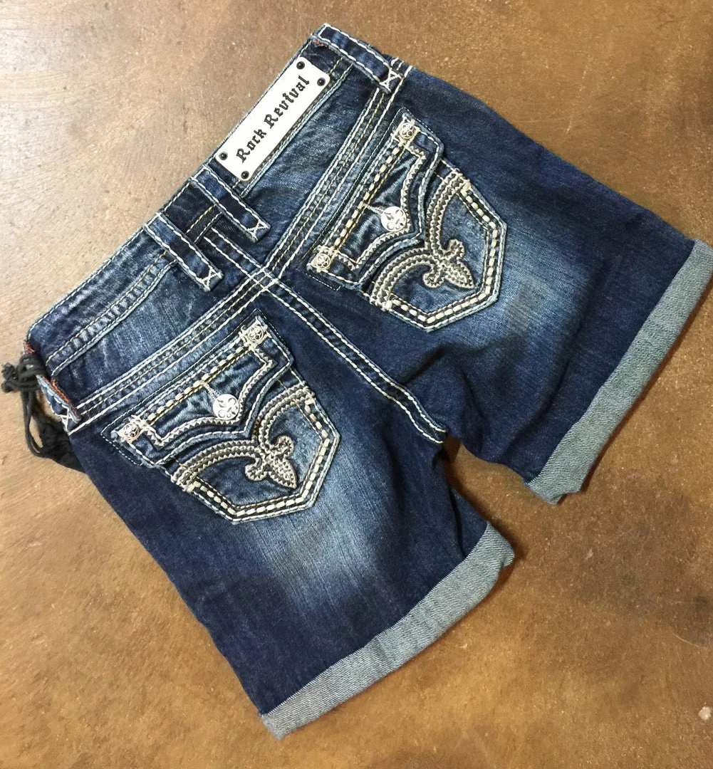 Rock Revival Kaylee Shorts with distressed denim on front and heavy white stitching with flap button pockets.