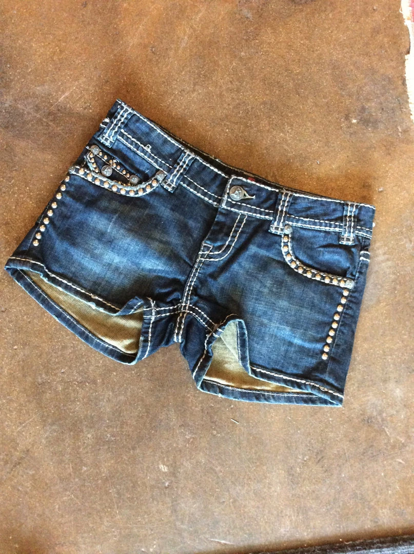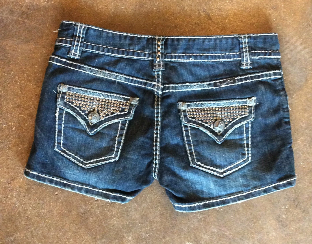Rock & Roll Cowgirl Denim shorts with studded detail and back flap pockets with rhinestones. Final Sale