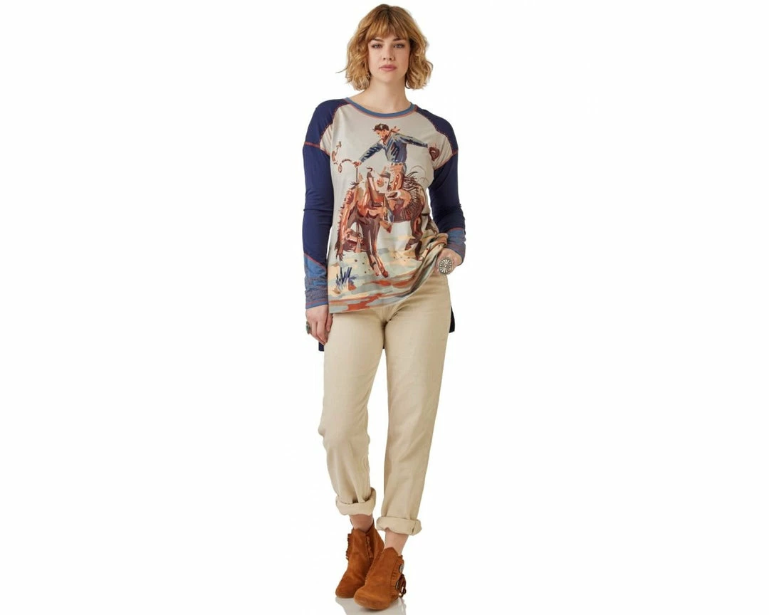 ย This chic casual top carries on the Eloise imagery of Till Goodan-style rodeo riders in earthy tones, dusty rose, and denim-inspired hues. Plus, it is that longer hi-low silhouette you ladies love!