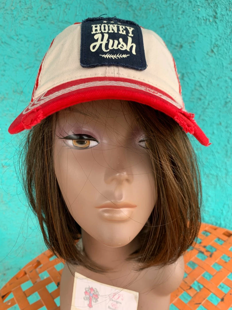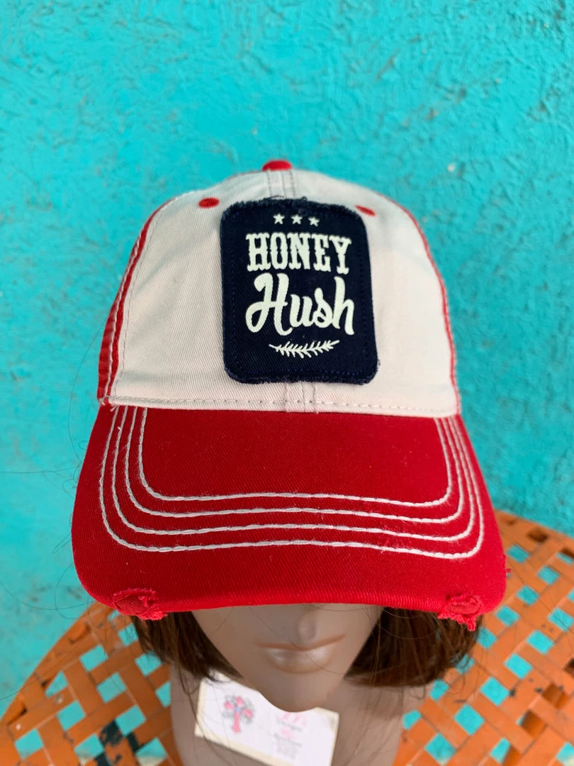 Honey Hush Ball cap in red and cream with patch on front, mesh backing.