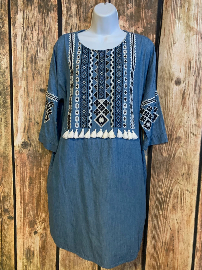 Andree Denim Dress with blue and white embroidery detail on front and sleeves