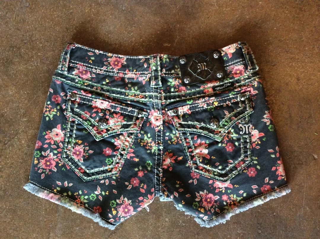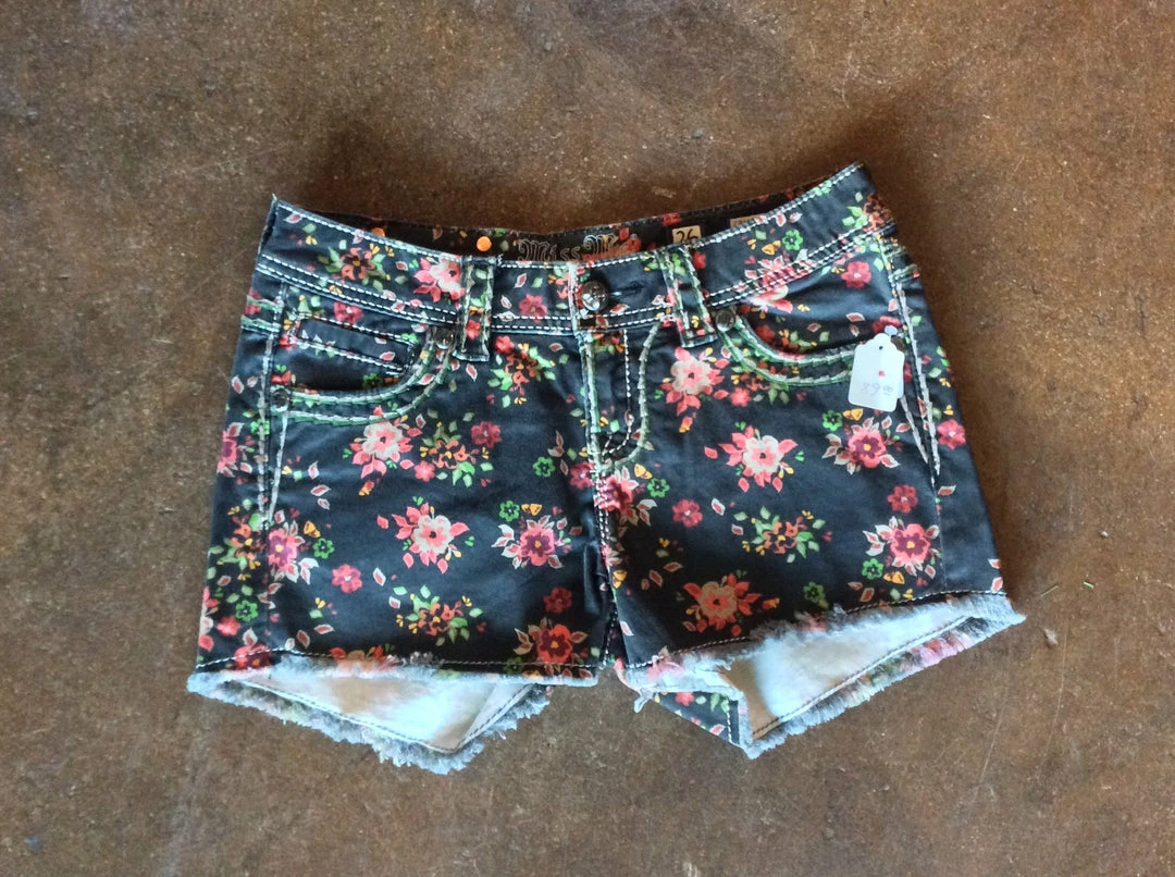 Miss Me Floral Print Shorts with Silver Stitching. Flap pockets on back and rhinestone details at corners.