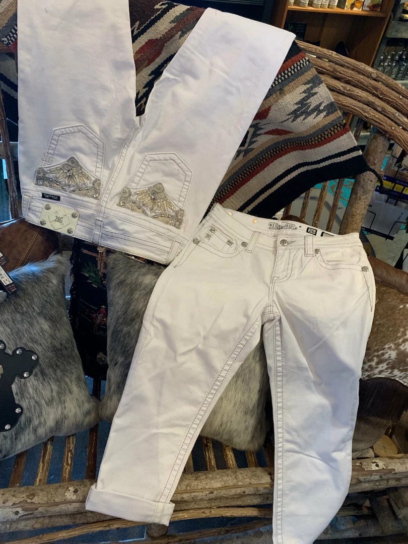 Miss Me White Boyfriend Capris with Silver Stitching and Back Flap Pockets with Lace and Rhinestones.Β Β Final Sale