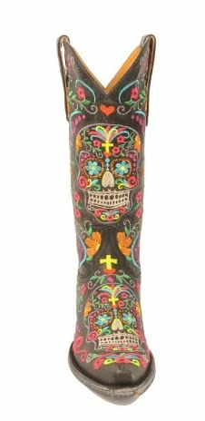 Our most popular sugar skull boot with vibrant embroidery. A must-have boot for your collection. 13″ shaft. Black leather. Snip toe.Β Originally $679.95