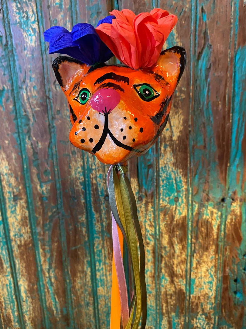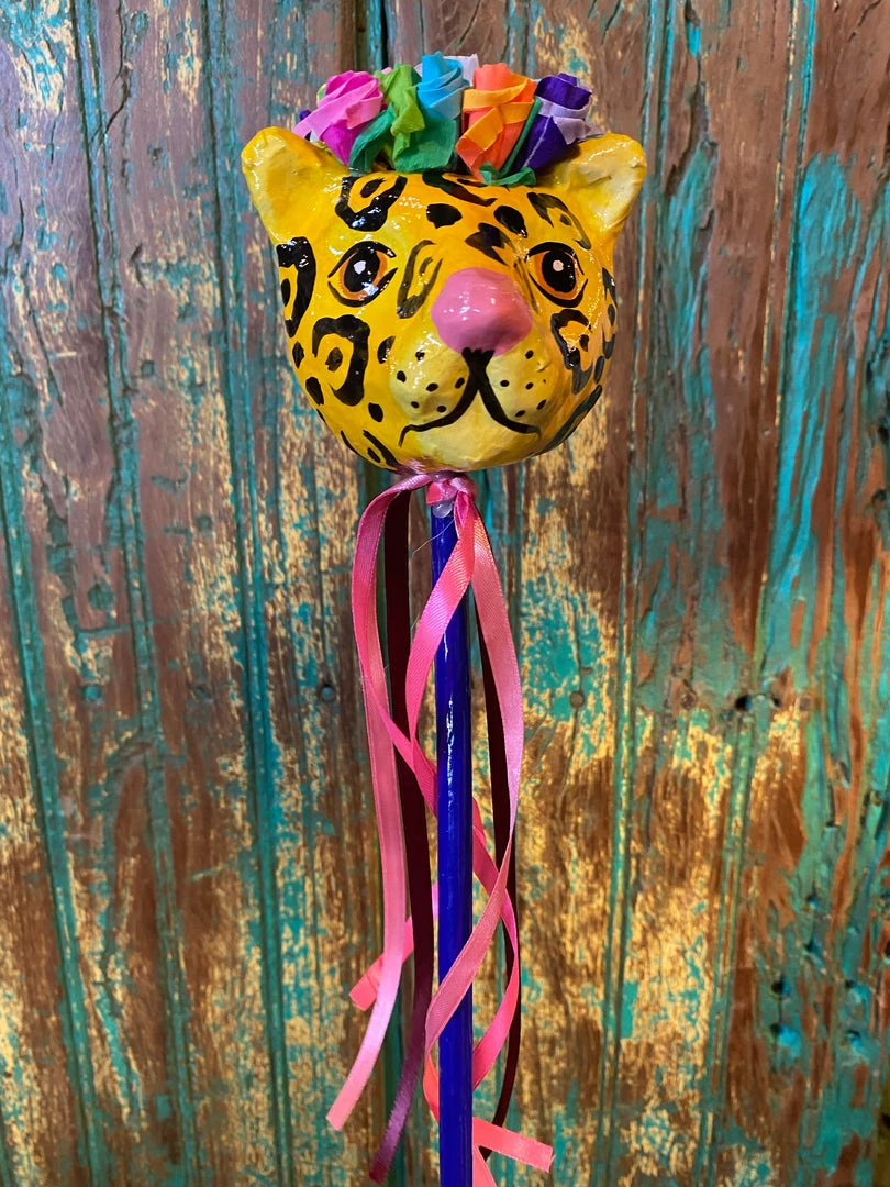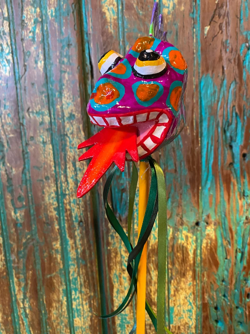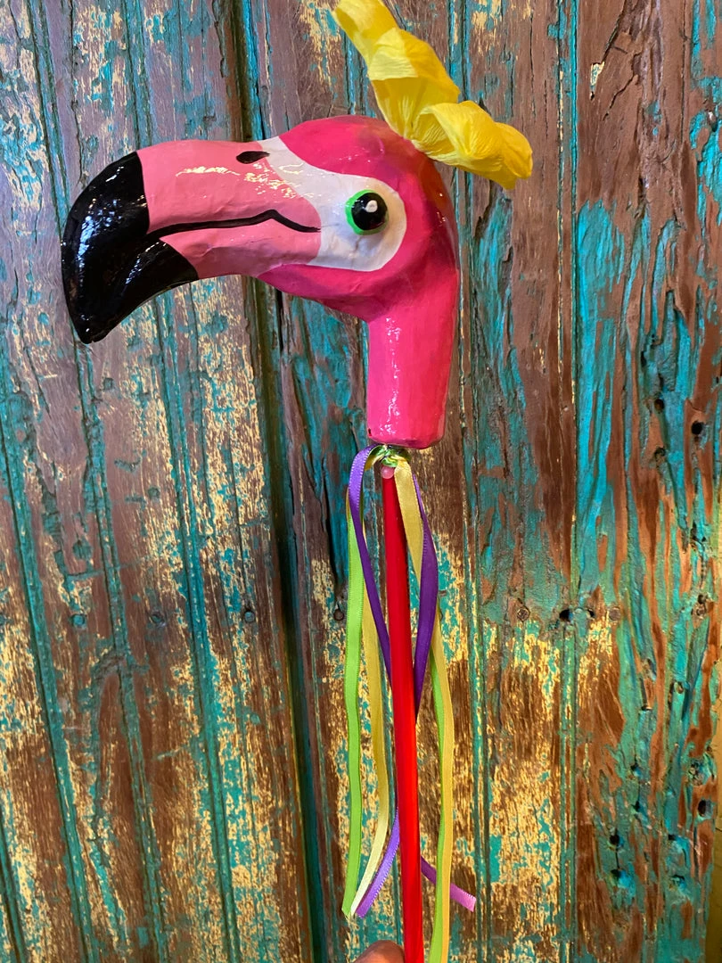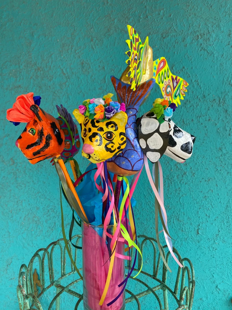 Consuela Party Shakers made of paper mache and hand painted with 3 dimentional detail on wood stick with ribbon streamers.