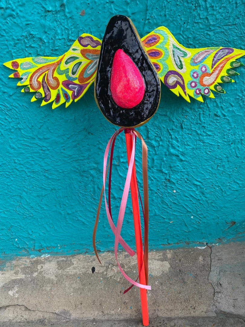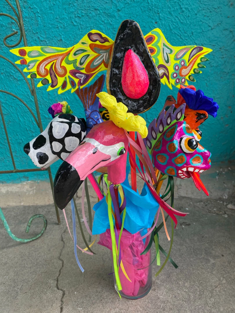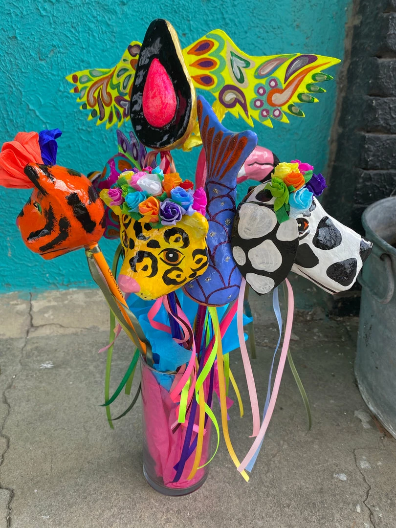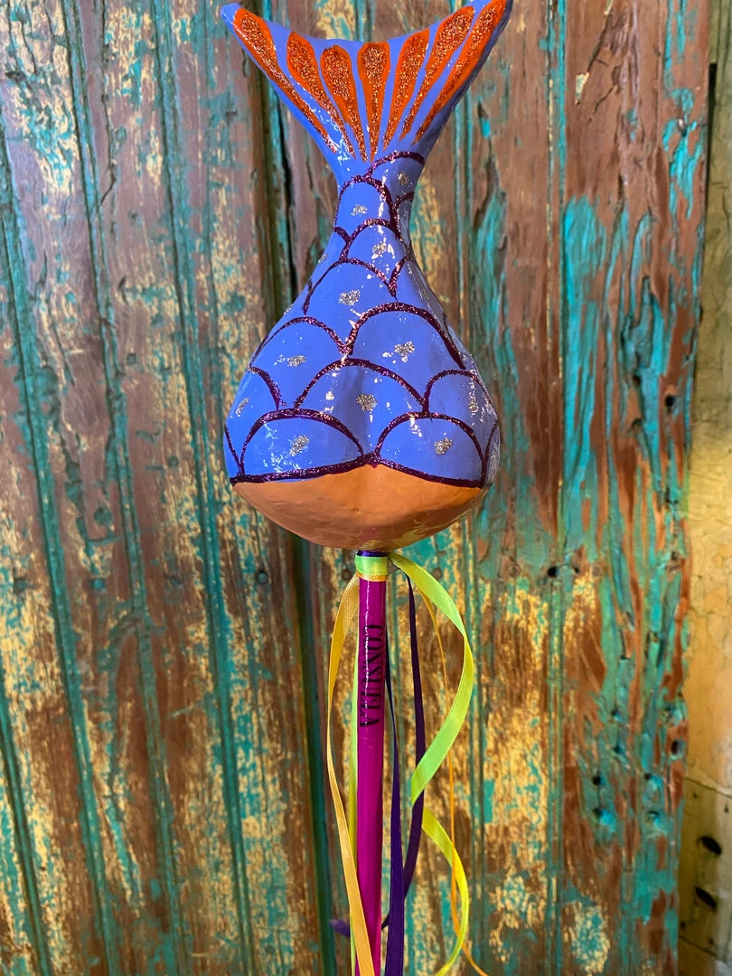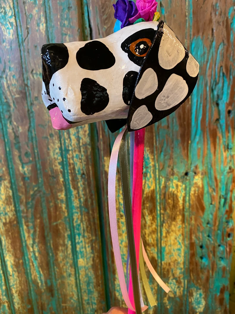 Consuela Party Shakers made of paper mache and hand painted with 3 dimentional detail on wood stick with ribbon streamers.