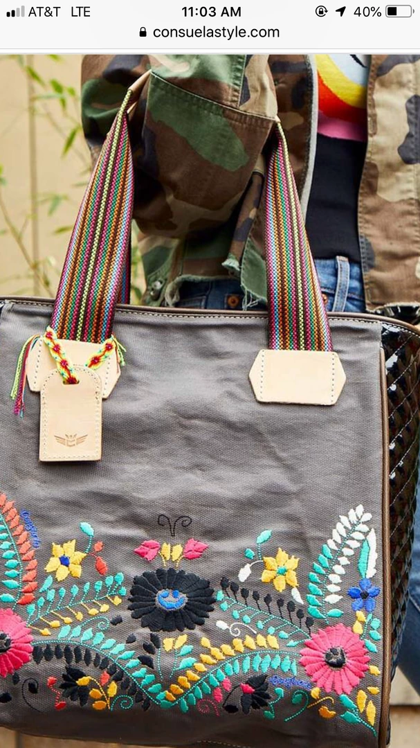 Our trademarked ConsuelaCloth™ is known for its durability, vibrancy, and ease of care. This bag includes our inspirational leather-embossed reminder to “Make Today Ridiculously Awesome.”