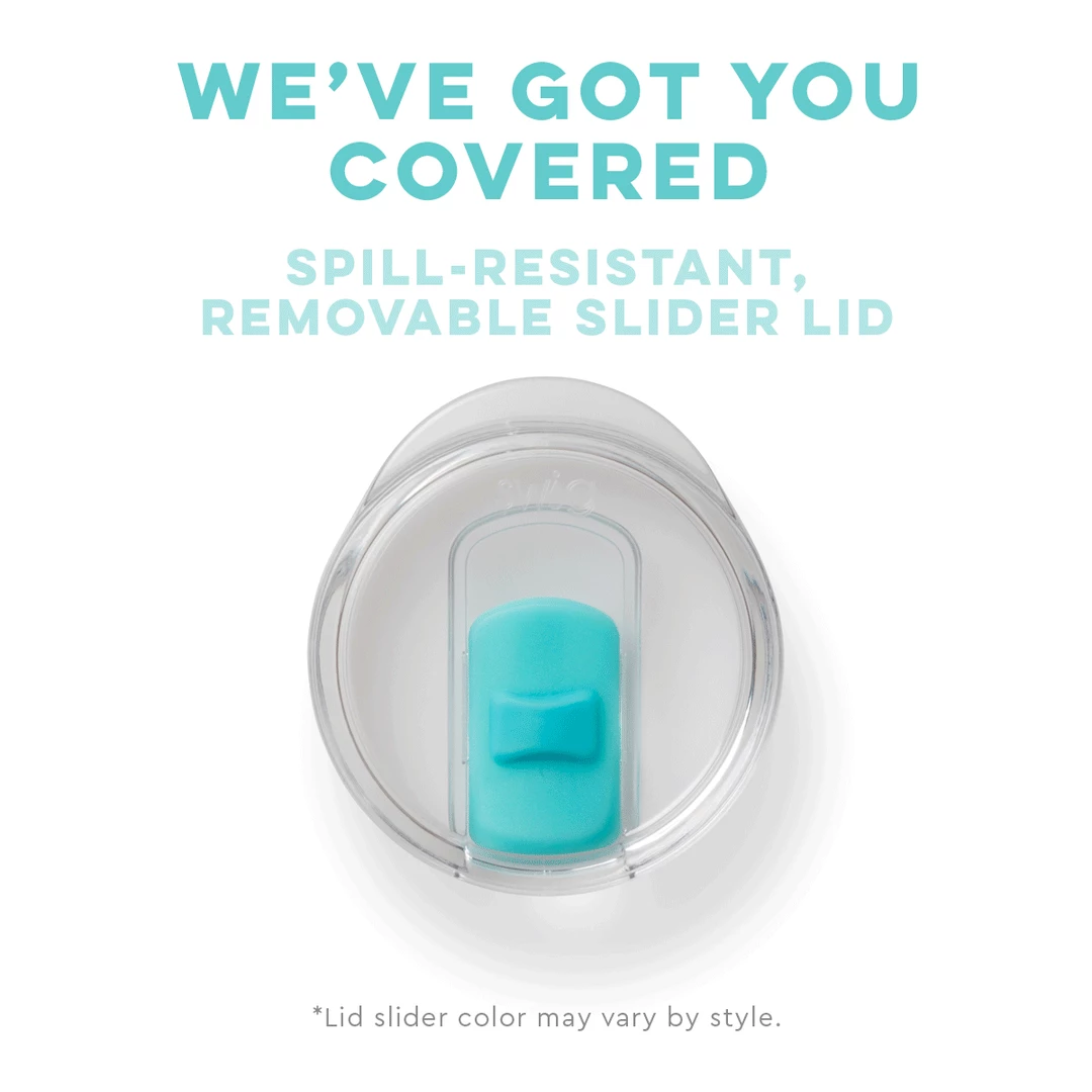 This Swig includes a slide-closure lid to reduce messes while on the move and to maximize temperature retention. The straw-friendly opening can be covered with the slider to minimize spills when not in use. The slider is removable for easy cleaning and will snap back in place. We also offer replacements lids in the slide-closure style, as well as an EZ flow option. Retail-ready replacement lids may be orderedΒ here!